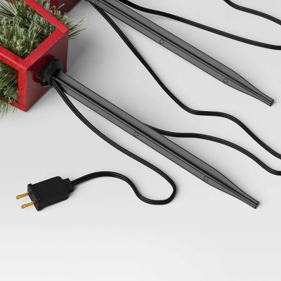 Light up your home for Christmas with this 3-Piece Incandescent Red Metal Lantern with Greenery Christmas Novelty Path Lights from Wondershop™. This set of path lights includes three bright red metal lanterns that are decorated with faux pine greenery for festive charm. It comes equipped with three clear light bulbs in a vintage shape with a flickering effect to cast a sparkling glow. The ground stakes allow for easy placement, and the end-to-end connector allows you to connect multiple light sets.