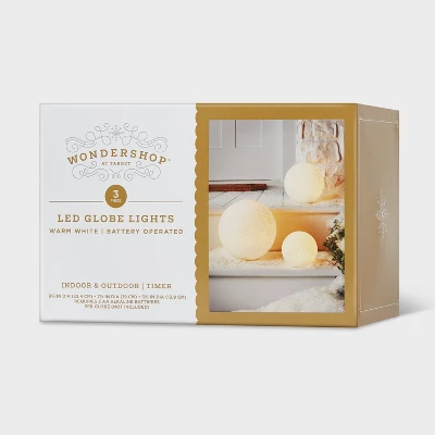 This 3-Piece LED Glittered Globe Christmas Novelty Sculpture Light from Wondershop™ is a versatile addition to your holiday decor, suitable for both indoor and outdoor use. This Christmas novelty sculpture features three glittered globes in different sizes, each embellished with a warm white LED bulb that casts a festive glow. These globes can be grouped or placed individually on tabletops, shelves, entryways, garden pedestals or patio ledges to create a warm and welcoming display with a snowy effect.